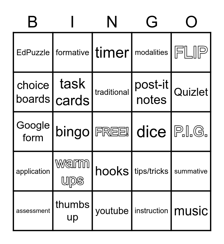 This bingo card has a free space and 24 words: warm ups, thumbs up, traditional, assessment, FLIP, EdPuzzle, choice boards, formative, dice, hooks, post-it notes, Google form, tips/tricks, summative, task cards, instruction, P.I.G., timer, Quizlet, bingo, music, application, modalities and youtube.