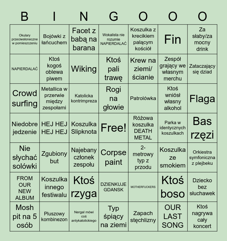 This bingo card has a free space and 48 words: MOTHERFUCKERS, Zespół grający we własnym merchu, Typ śpiący na ziemi, HEJ HEJ HEJ HEJ, Katolicka kontrimpreza, Bas rzęzi, Bojówki z łańcuchem, Pluszowy kombinezon, Fin, Corpse paint, Za słaby/za mocny drink, Wokalista nie rozumie NAPIERDALAĆ, Ktoś wniósł własny alkohol, Patrolówka, FROM OUR NEW ALBUM, Parka w identycznych koszulkach, NAPIERDALAĆ, Zataczający się dziad, Ktoś boso, Koszulka z krecikiem palącym kościół, Krew na ziemi/ścianie, Koszulka Slipknota, Okulary przeciwsłoneczne w pomieszczeniu, Ktoś kogoś oblewa piwem, Dziecko bez słuchawek, Wiking, Flaga, Mosh pit na 5 osób, Rogi na głowie, Metallica w przerwie między zespołami, OUR LAST SONG, Różowa koszulka DEATH METAL, Orkiestra symfoniczna z plejbeku, Koszulka innego festiwalu, Niedobre jedzenie, 2-metrowy typ z przodu, Koszulka ze smokiem, Crowd surfing, Najebany członek zespołu, Ktoś rzyga, Nie słychać solówki, Ktoś nagrywa cały koncert, Facet z babą na barana, Nergal mówi coś antykatolickiego, Ktoś pali trawę, DZIENKUJE GDANSK, Zgubiony but and Zapach stęchlizny.