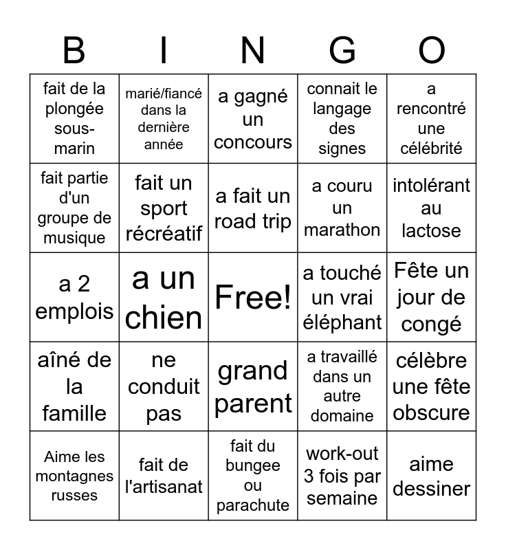 This bingo card has a free space and 29 words: Aime les montagnes russes, a un chat, a un chien, a un bateau, fait de la plongée sous-marin, a gagné un concours, fait un sport récréatif, ne conduit pas, a touché un vrai éléphant, fait de l'artisanat, Fête un jour de congé, aime dessiner, fait du bungee ou parachute, work-out 3 fois par semaine, intolérant au lactose, a ammassé $1000 pour un organisme, grand parent, aîné de la famille, a rencontré une célébrité, a 2 emplois, a travaillé dans un autre domaine, a vue un pièce de théatre l'an dernier, a couru un marathon, fait partie d'un groupe de musique, connait le langage des signes, marié/fiancé dans la dernière année, célèbre une fête obscure, a fait un road trip and parle 3 langues.