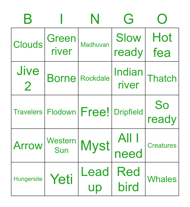 This bingo card has a free space and 24 words: Western Sun, Yeti, Rockdale, Hungersite, Hot fea, Clouds, Jive 2, Green river, Dripfield, Myst, Indian river, Travelers, All I need, Creatures, Borne, Red bird, So ready, Madhuvan, Thatch, Flodown, Whales, Arrow, Slow ready and Lead up.