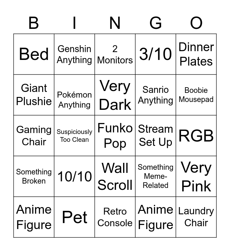 This bingo card has a free space and 24 words: 10/10, Pet, Very Dark, Anime Figure, Dinner Plates, Bed, Giant Plushie, Genshin Anything, Stream Set Up, Wall Scroll, Sanrio Anything, Gaming Chair, Something Meme-Related, Very Pink, Pokémon Anything, Anime Figure, RGB, 2 Monitors, Boobie Mousepad, Suspiciously Too Clean, Laundry Chair, Something Broken, 3/10 and Retro Console.