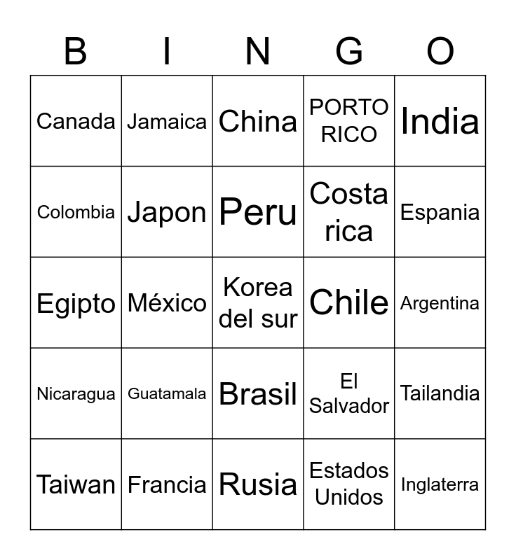 This bingo card has 30 words: Francia, Alemania, México, Italia, Canada, China, Japon, Brasil, Chile, Rusia, Argentina, Korea del sur, Estados Unidos, Inglaterra, Espania, Equador, El Salvador, Nicaragua, Guatamala, India, Egipto, Cuba, Jamaica, Costa rica, Colombia, PORTO RICO, Tailandia, Taiwan, Peru and Vietam.