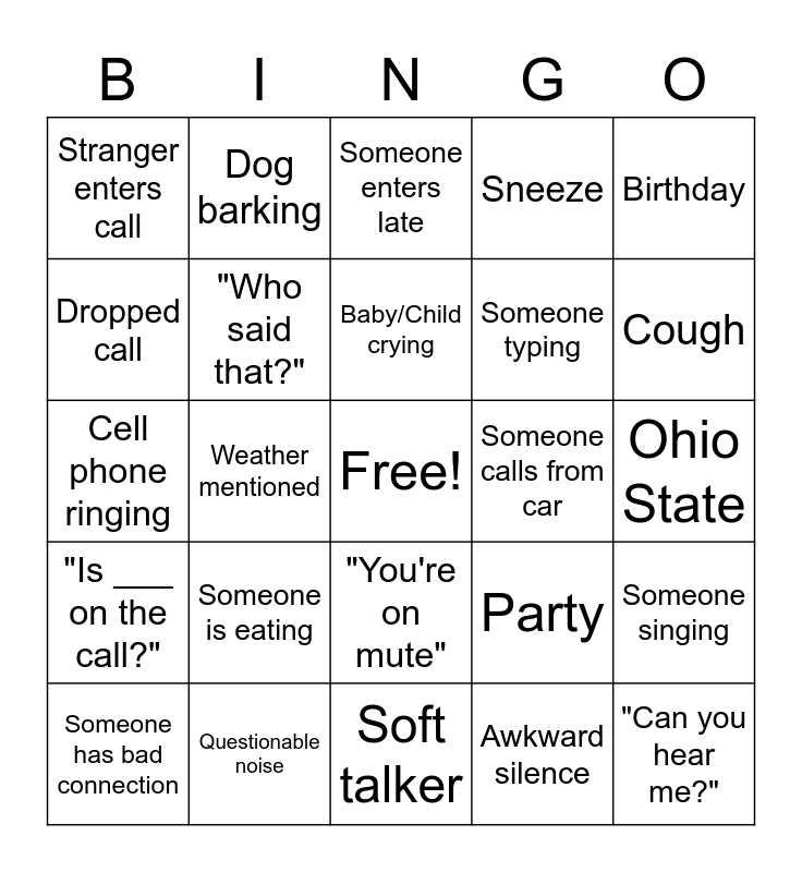 This bingo card has a free space and 28 words: Someone singing, Two people with same name, Someone typing, Awkward silence, Dropped call, Someone enters late, Dog barking, "Is ___ on the call?", Someone calls from car, Someone has bad connection, Cell phone ringing, Sneeze, Questionable noise, Soft talker, Cough, Inappropriate comment, Someone is eating, "Who said that?", Baby/Child crying, "You're on mute", Stranger enters call, Loud talker, "Can you hear me?", Weather mentioned, Ohio State, Party, Birthday and Future Plans.