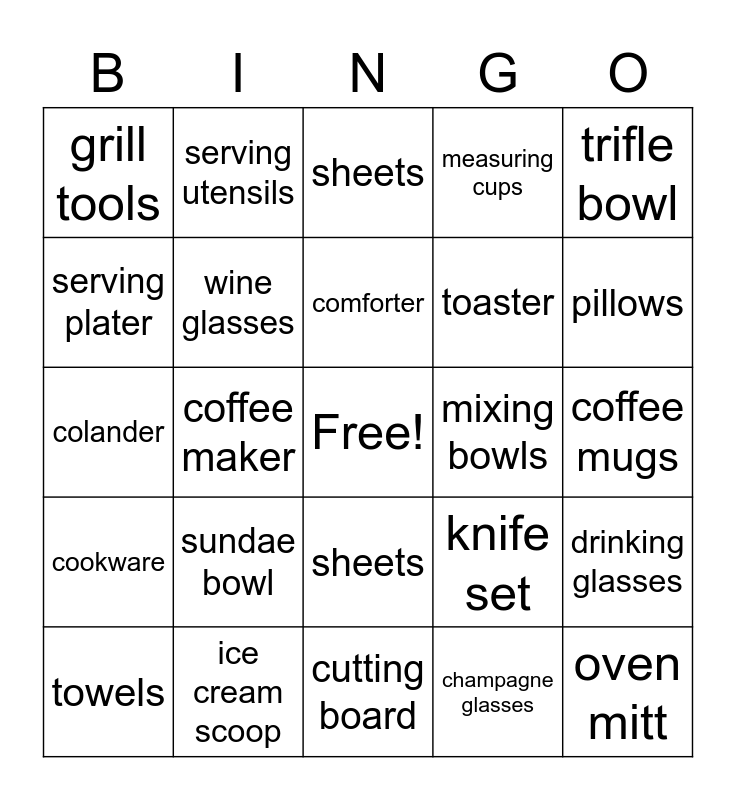 This bingo card has a free space and 24 words: sundae bowl, ice cream scoop, comforter, towels, trifle bowl, grill tools, serving plater, serving utensils, mixing bowls, sheets, toaster, colander, knife set, drinking glasses, wine glasses, champagne glasses, coffee mugs, sheets, pillows, coffee maker, oven mitt, cookware, measuring cups and cutting board.