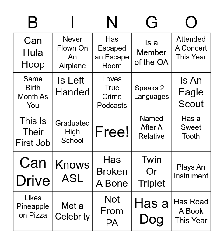 This bingo card has a free space and 24 words: Knows ASL, Met a Celebrity, Loves True Crime Podcasts, Likes Pineapple on Pizza, Attended A Concert This Year, Can Hula Hoop, Same Birth Month As You, Never Flown On An Airplane, Named After A Relative, Has Broken A Bone, Speaks 2+ Languages, This Is Their First Job, Twin Or Triplet, Plays An Instrument, Is Left-Handed, Has a Dog, Has a Sweet Tooth, Has Escaped an Escape Room, Is An Eagle Scout, Graduated High School, Has Read A Book This Year, Can Drive, Is a Member of the OA and Not From PA.