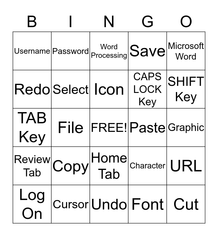 This bingo card has a free space and 24 words: Copy, Cursor, Icon, Log On, Microsoft Word, Username, Redo, Password, Paste, Home Tab, CAPS LOCK Key, TAB Key, Character, URL, Select, Font, Graphic, Word Processing, SHIFT Key, File, Cut, Review Tab, Save and Undo.
