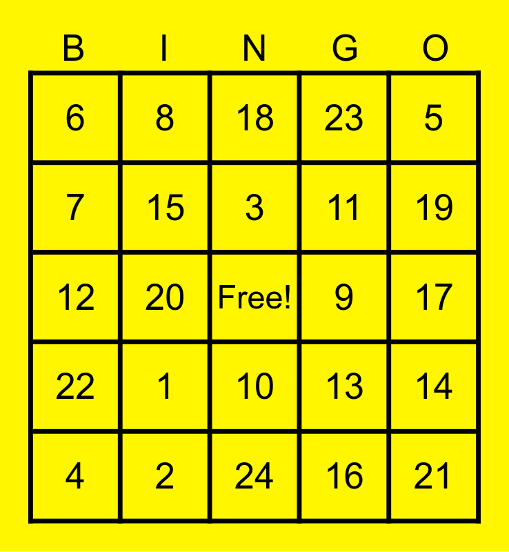 This bingo card has a free space and 24 words: 1, 2, 3, 4, 5, 6, 7, 8, 9, 10, 11, 12, 13, 14, 15, 16, 17, 18, 19, 20, 21, 22, 23 and 24.