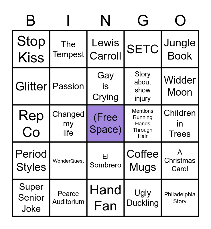 This bingo card has a free space and 24 words: WonderQuest, Pearce Auditorium, Gay is Crying, Super Senior Joke, Jungle Book, Stop Kiss, Glitter, The Tempest, Mentions Running Hands Through Hair, El Sombrero, Story about show injury, Rep Co, Coffee Mugs, A Christmas Carol, Passion, Ugly Duckling, Children in Trees, Lewis Carroll, Widder Moon, Changed my life, Philadelphia Story, Period Styles, SETC and Hand Fan.
