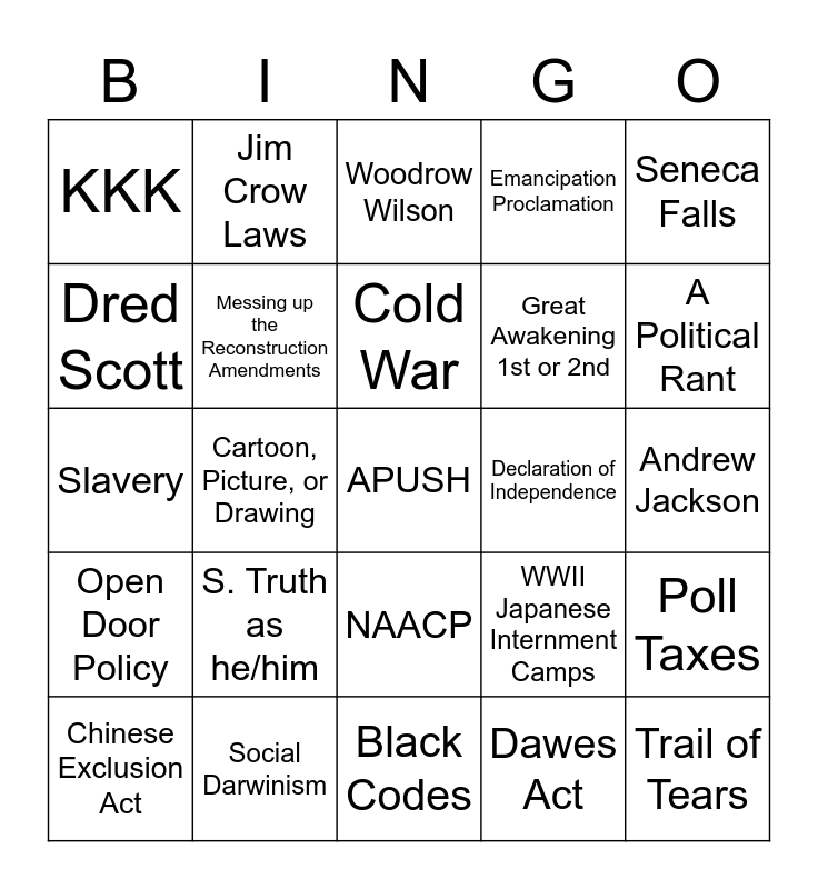 This bingo card has a free space and 24 words: S. Truth as he/him, Social Darwinism, Cold War, Chinese Exclusion Act, Seneca Falls, KKK, Dred Scott, Jim Crow Laws, Declaration of Independence, NAACP, Great Awakening 1st or 2nd, Slavery, WWII Japanese Internment Camps, Poll Taxes, Messing up the Reconstruction Amendments, Dawes Act, Andrew Jackson, Woodrow Wilson, A Political Rant, Cartoon, Picture, or Drawing, Trail of Tears, Open Door Policy, Emancipation Proclamation and Black Codes.