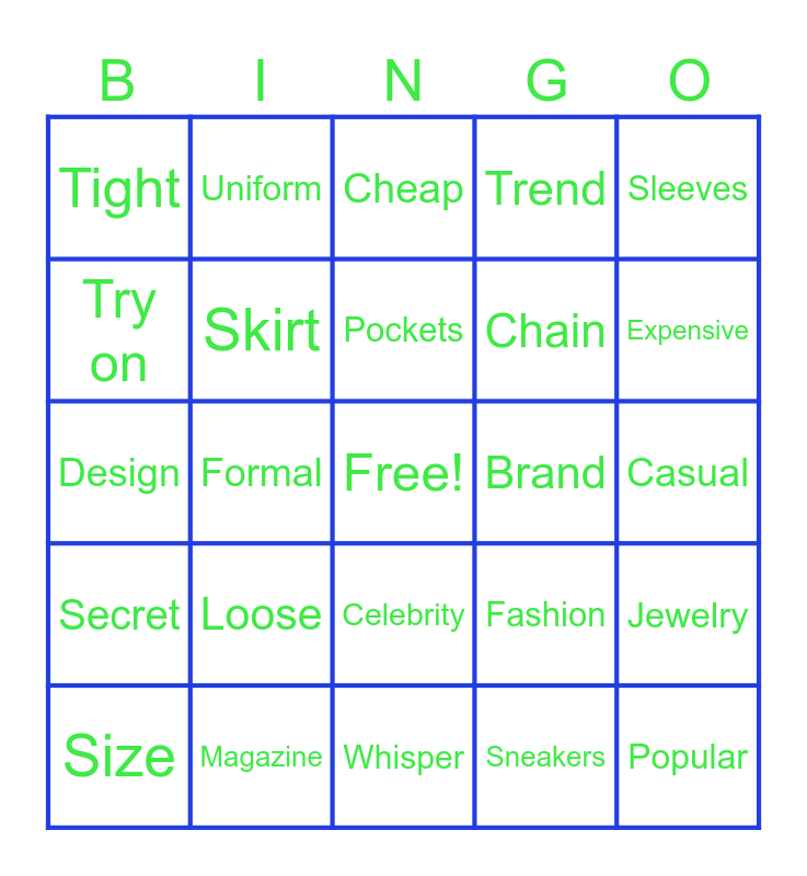 This bingo card has a free space and 24 words: Loose, Magazine, Pockets, Size, Sleeves, Tight, Try on, Uniform, Brand, Celebrity, Chain, Design, Fashion, Jewelry, Skirt, Sneakers, Casual, Cheap, Expensive, Formal, Popular, Secret, Trend and Whisper.