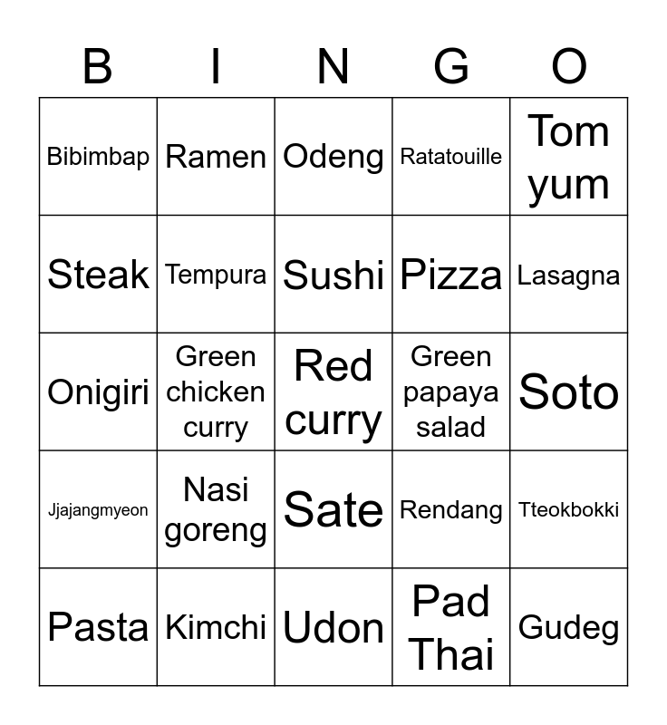 This bingo card has a free space and 24 words: Nasi goreng, Kimchi, Sushi, Pasta, Tom yum, Bibimbap, Steak, Ramen, Green papaya salad, Sate, Pizza, Onigiri, Rendang, Tteokbokki, Tempura, Pad Thai, Soto, Odeng, Lasagna, Green chicken curry, Gudeg, Jjajangmyeon, Ratatouille and Udon.