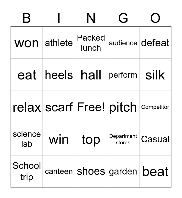 This bingo card has a free space and 62 words: skirt, canteen, gym, science lab, disappointment, sandals, heels, trainers, perform, stage, audience, wear, eat, Attend, Take up, won, beat, defeat, court, hall, pitch, Packed lunch, School trip, garden, Work hard, cotton, wool, leather, Casual, smart, fashionable, Traditional, stylish, champion, Competitor, athlete, play, Reception desk, scarf, gym, relax, Team sports, win, Street market, silk, Department stores, Jewerlly, amazed, annoyed, anxious, top, shoes, club, sport, classroom, Excited, Satisfied, Surprised, worried, serious, Impressed and Jealous.