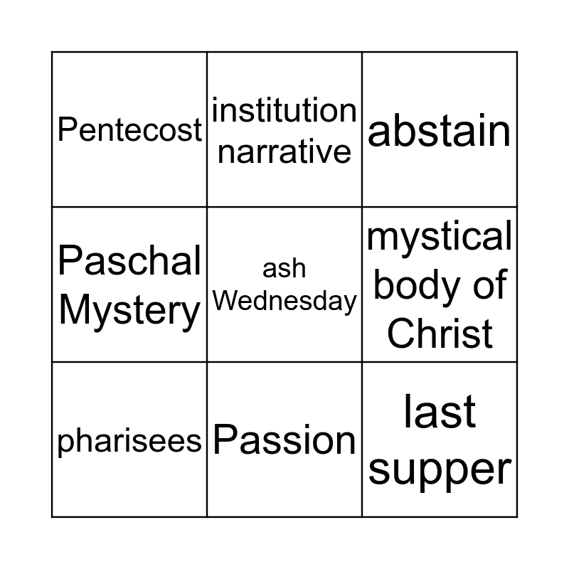 This bingo card has 19 words: conversion, fasting, abstain, almsgiving, advocate, ash Wednesday, lent, Pentecost, institution narrative, last supper, liturgy, mystical body of Christ, pharisees, real presence, transubstantiation, Apostles Creed, Paschal Mystery, Passion and Transfiguration.