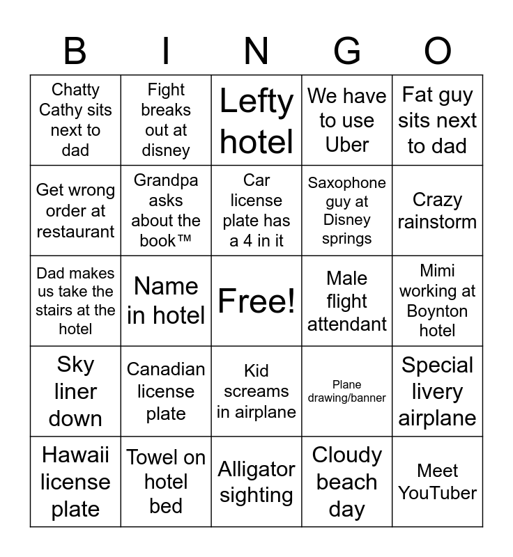 This bingo card has a free space and 24 words: Canadian license plate, Towel on hotel bed, Car license plate has a 4 in it, Hawaii license plate, Fat guy sits next to dad, Chatty Cathy sits next to dad, Get wrong order at restaurant, Fight breaks out at disney, Male flight attendant, Kid screams in airplane, Saxophone guy at Disney springs, Dad makes us take the stairs at the hotel, Plane drawing/banner, Special livery airplane, Grandpa asks about the book™️, Cloudy beach day, Mimi working at Boynton hotel, Lefty hotel, Crazy rainstorm, Name in hotel, Meet YouTuber, Sky liner down, We have to use Uber and Alligator sighting.
