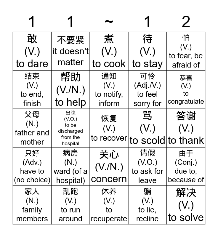 This bingo card has 25 words: 病房 (N.) ward (of a hospital), 休养 (V.) to recuperate, 通知 (V.) to notify, inform, 家人 (N.) family members, 怕 (V.) to fear, be afraid of, 敢 (V.) to dare, 结束 (V.) to end, finish, 不要紧 it doesn't matter, 骂 (V.) to scold, 关心 (V./N.) concern, 可怜 (Adj./V.) to feel sorry for, 父母 (N.) father and mother, 请假 (V.O.) to ask for leave, 由于 (Conj.) due to, because of, 帮助 (V./N.) to help, 解决 (V.) to solve, 答谢 (V.) to thank, 煮 (V.) to cook, 恭喜 (V.) to congratulate, 出院 (V.O.) to be discharged from the hospital, 恢复 (V.) to recover, 乱跑 (V.) to run around, 只好 (Adv.) have to (no choice), 待 (V.) to stay and 躺 (V.) to lie, recline.