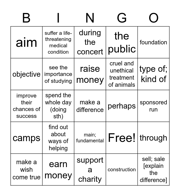 This bingo card has 25 words: find out about ways of helping, support a charity, raise money, make a wish come true, foundation, aim, objective, suffer a life-threatening medical condition, perhaps, main; fundamental, cruel and unethical treatment of animals, improve their chances of success, Free!, through, see the importance of studying, sell; sale [explain the difference], sponsored run, during the concert, type of; kind of, spend the whole day (doing sth), make a difference, earn money, camps, the public and construction.