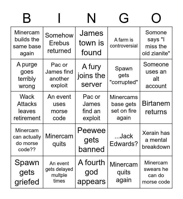 This bingo card has a free space and 24 words: Minercam quits, An event gets delayed multple times, A fury joins the server, Spawn gets griefed, Somone says "I miss the old zianite", Minercam builds the same base again, A purge goes terribly wrong, Somehow Erebus returned, Minercams base gets set on fire again, Peewee gets banned, Spawn gets "corrupted", Wack Attacks leaves retirement, ...Jack Edwards?, Xerain has a mental breakdown, Pac or James find another exploit, Minercam quits again, Birtanem returns, James town is found, Someone uses an alt account, An event uses morse code, Minercam swears he can do morse code, Minercam can actually do morse code??, A farm is controversial and A fourth god appears.