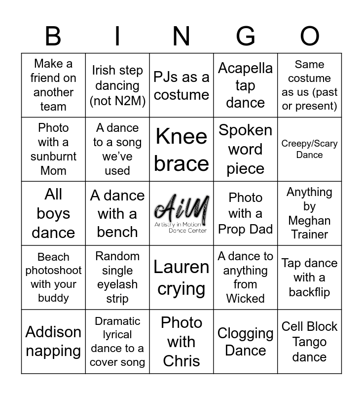 This bingo card has a free space and 25 words: Random single eyelash strip, Photo with Chris, Knee brace, Addison napping, Same costume as us (past or present), Make a friend on another team, Photo with a sunburnt Mom, Irish step dancing (not N2M), Photo with a Prop Dad, Lauren crying, Spoken word piece, All boys dance, A dance to anything from Wicked, Tap dance with a backflip, A dance to a song we’ve used, A dance to Feelin’ Good, Anything by Meghan Trainer, PJs as a costume, Creepy/Scary Dance, A dance with a bench, Cell Block Tango dance, Dramatic lyrical dance to a cover song, Beach photoshoot with your buddy, Acapella tap dance and Clogging Dance.