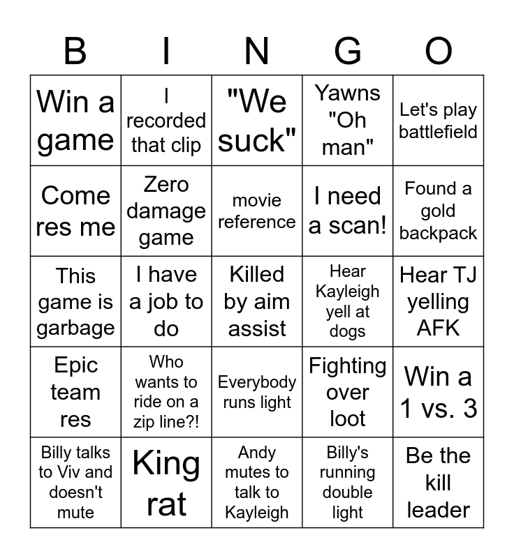This bingo card has a free space and 24 words: Who wants to ride on a zip line?!, King rat, movie reference, Billy talks to Viv and doesn't mute, Let's play battlefield, Win a game, Come res me, I recorded that clip, Hear Kayleigh yell at dogs, Everybody runs light, I need a scan!, This game is garbage, Fighting over loot, Win a 1 vs. 3, Zero damage game, Billy's running double light, Hear TJ yelling AFK, "We suck", Found a gold backpack, I have a job to do, Be the kill leader, Epic team res, Yawns "Oh man" and Andy mutes to talk to Kayleigh.