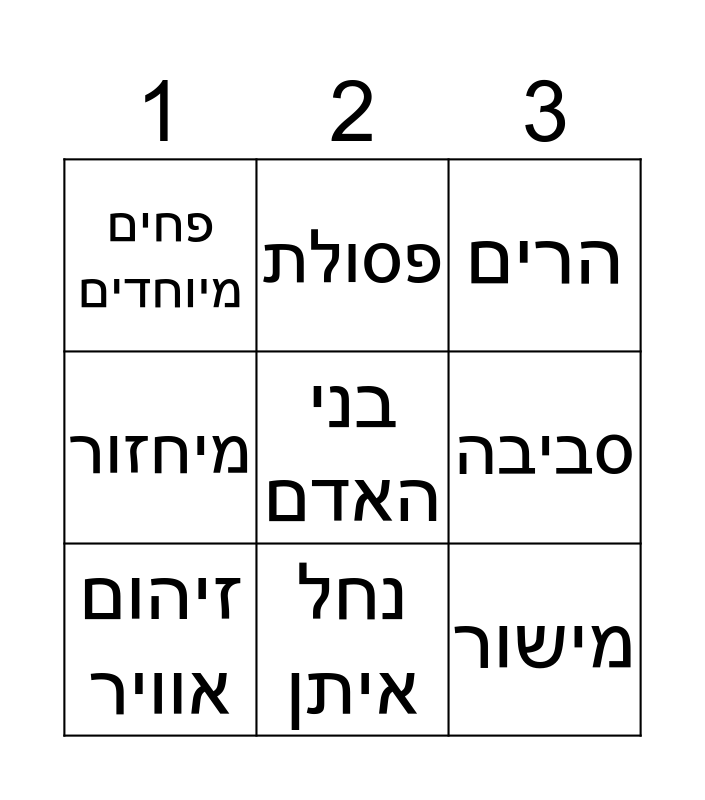 This bingo card has a free space and 8 words: סביבה, הרים, פסולת, זיהום אוויר, פחים מיוחדים, מישור, מיחזור and נחל איתן.