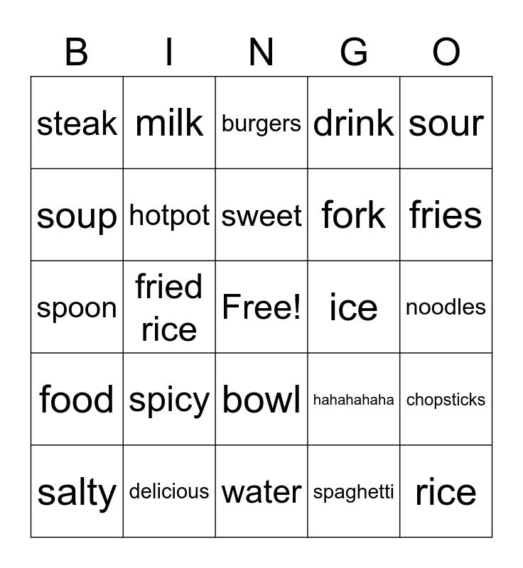 This bingo card has a free space and 24 words: spicy, delicious, sweet, salty, sour, steak, soup, milk, ice, bowl, fork, spoon, hahahahaha, chopsticks, hotpot, spaghetti, noodles, burgers, fries, fried rice, rice, food, drink and water.