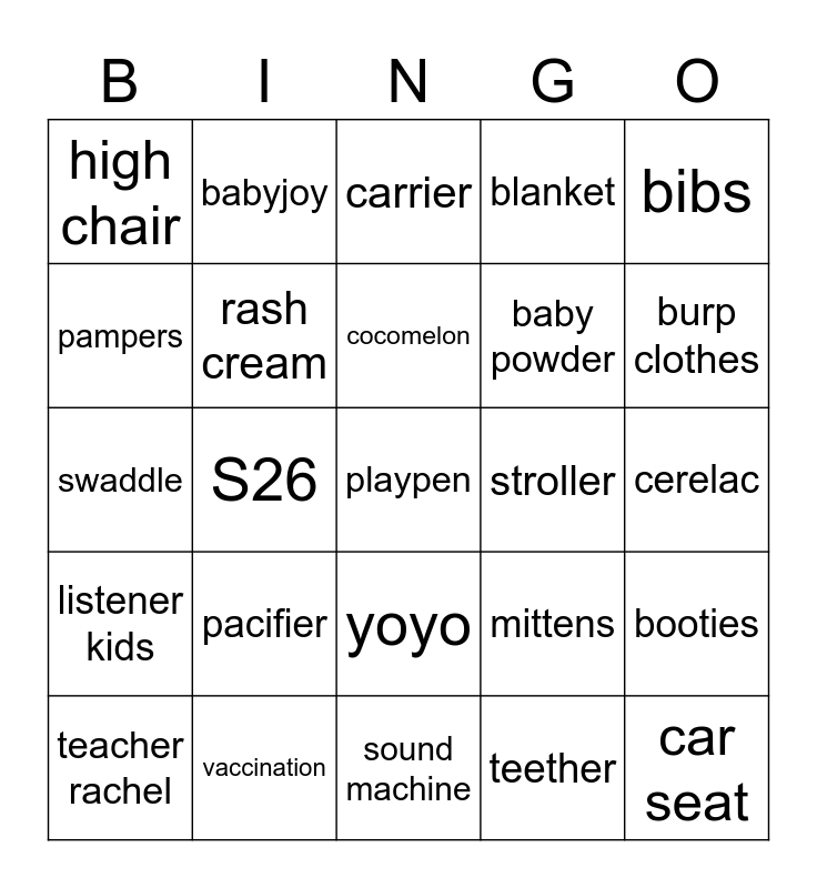 This bingo card has 25 words: pacifier, sound machine, cocomelon, teacher rachel, bibs, high chair, pampers, babyjoy, stroller, yoyo, baby powder, swaddle, mittens, booties, rash cream, car seat, cerelac, carrier, burp clothes, S26, playpen, vaccination, listener kids, blanket and teether.