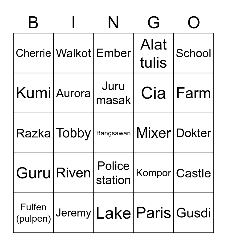 This bingo card has a free space and 24 words: Riven, Jeremy, Juru masak, Fulfen (pulpen), School, Cherrie, Kumi, Walkot, Mixer, Police station, Cia, Razka, Kompor, Castle, Aurora, Paris, Dokter, Ember, Farm, Tobby, Gusdi, Guru, Alat tulis and Lake.
