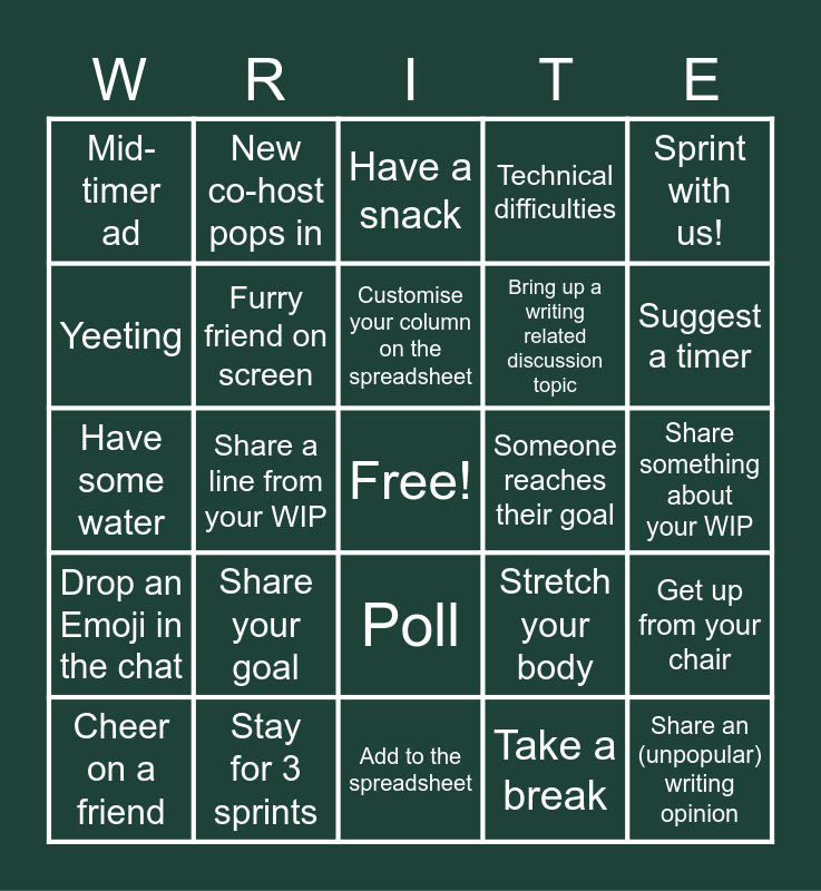 This bingo card has a free space and 25 words: Share your goal, Add to the spreadsheet, Customise your column on the spreadsheet, Cheer on a friend, Sprint with us!, Mid-timer ad, Yeeting, New co-host pops in, Someone reaches their goal, Poll, Bring up a writing related discussion topic, Have some water, Stretch your body, Get up from your chair, Furry friend on screen, Promote yourself!, Share something about your WIP, Have a snack, Suggest a timer, Share a line from your WIP, Share an (unpopular) writing opinion, Stay for 3 sprints, Drop an Emoji in the chat, Technical difficulties and Take a break.