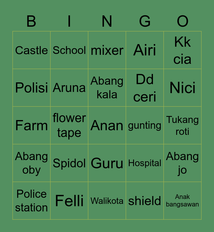This bingo card has a free space and 24 words: Spidol, Felli, Abang kala, Police station, Kk cia, Castle, Polisi, School, gunting, Guru, Dd ceri, Farm, Hospital, Abang jo, Aruna, shield, Tukang roti, mixer, Nici, flower tape, Anak bangsawan, Abang oby, Airi and Walikota.