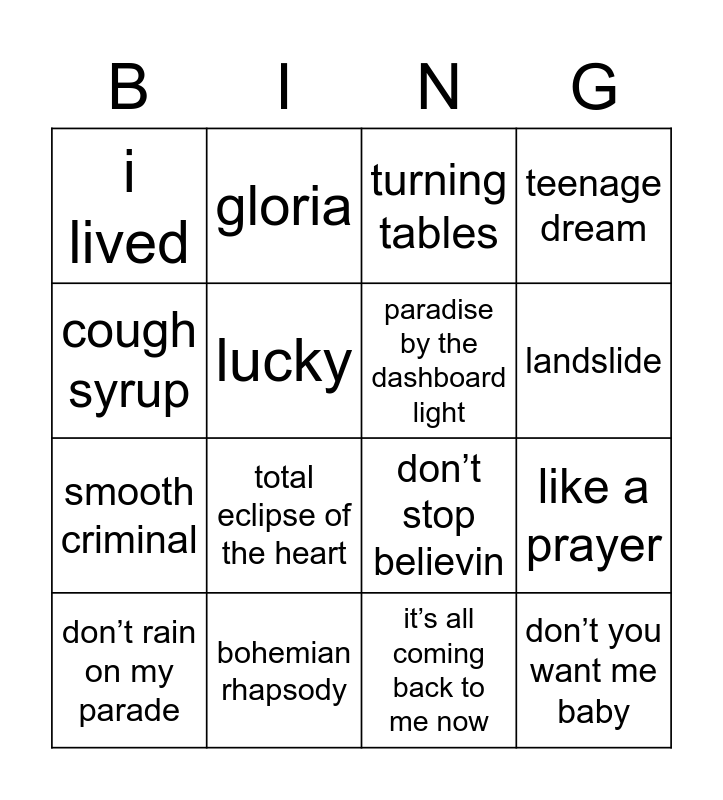 This bingo card has 16 words: bohemian rhapsody, like a prayer, turning tables, i lived, smooth criminal, gloria, don’t stop believin, it’s all coming back to me now, cough syrup, lucky, don’t rain on my parade, teenage dream, total eclipse of the heart, landslide, paradise by the dashboard light and don’t you want me baby.