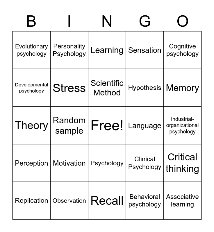 This bingo card has a free space and 26 words: Psychology, Behavioral psychology, Scientific Method, Observation, Cognitive psychology, Evolutionary psychology, Developmental psychology, Personality Psychology, Industrial-organizational psychology, Clinical Psychology, Hypothesis, Theory, Critical thinking, Replication, Random sample, Central Nervous System, Sensation, Perception, Learning, Associative learning, Memory, Recall, Language, Motivation, Stress and Personality.