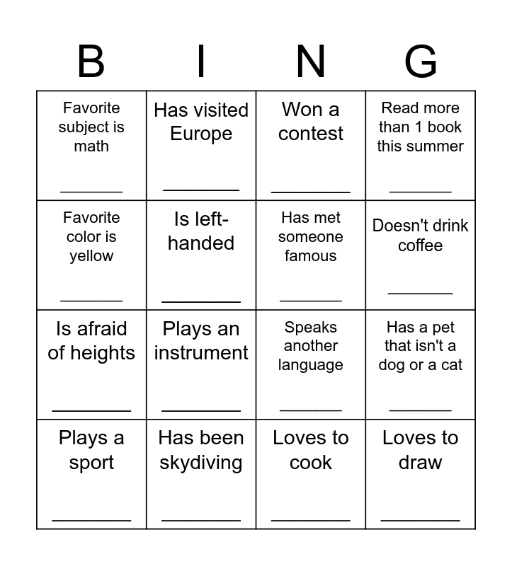 This bingo card has 16 words: Has been skydiving _______, Has a pet that isn't a dog or a cat _______, Won a contest _______, Favorite subject is math _______, Is afraid of heights _______, Has visited Europe _______, Speaks another language _______, Loves to cook _______, Favorite color is yellow _______, Is left-handed _______, Plays a sport _______, Read more than 1 book this summer _______, Plays an instrument _______, Doesn't drink coffee _______, Has met someone famous _______ and Loves to draw _______.