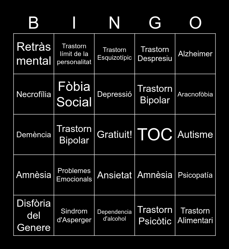 This bingo card has a free space and 24 words: Problemes Emocionals, Sindrom d'Asperger, Depressió, Disfòria del Genere, Alzheimer, Retràs mental, Necrofília, Trastorn límit de la personalitat, TOC, Ansietat, Trastorn Bipolar, Demència, Amnèsia, Psicopatía, Fòbia Social, Trastorn Psicòtic, Autisme, Trastorn Esquizotípic, Aracnofòbia, Trastorn Bipolar, Trastorn Alimentari, Amnèsia, Trastorn Despresiu and Dependencia d'alcohol.