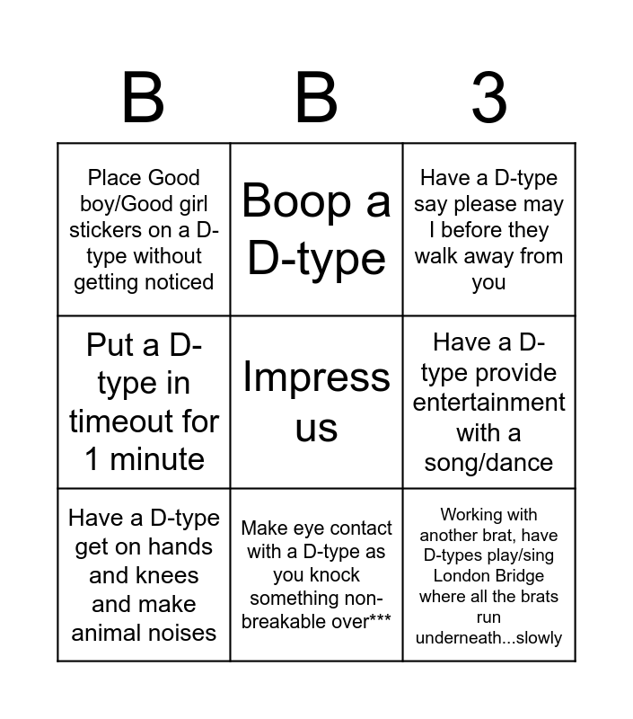 This bingo card has a free space and 8 words: Put a D-type in timeout for 1 minute, Boop a D-type, Have a D-type provide entertainment with a song/dance, Have a D-type get on hands and knees and make animal noises, Have a D-type say please may I before they walk away from you, Place Good boy/Good girl stickers on a D-type without getting noticed, Make eye contact with a D-type as you knock something non-breakable over*** and Working with another brat, have D-types play/sing London Bridge where all the brats run underneath...slowly.