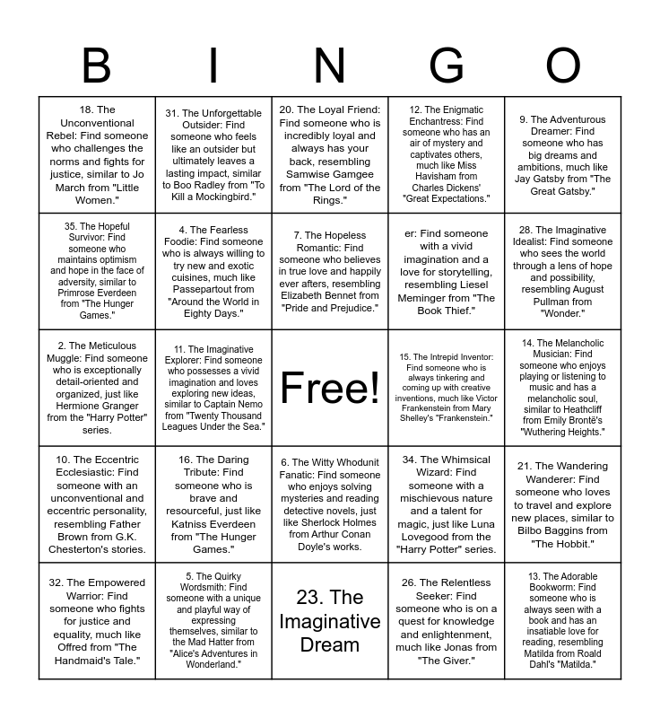 This bingo card has a free space and 41 words: 1. The Curious Chatterbox: Find someone who loves asking questions as much as Alice from "Alice's Adventures in Wonderland.", 2. The Meticulous Muggle: Find someone who is exceptionally detail-oriented and organized, just like Hermione Granger from the "Harry Potter" series., 3. The Daydreaming Dreamer: Find someone who often gets lost in their own thoughts, resembling Walter Mitty from "The Secret Life of Walter Mitty.", 4. The Fearless Foodie: Find someone who is always willing to try new and exotic cuisines, much like Passepartout from "Around the World in Eighty Days.", 5. The Quirky Wordsmith: Find someone with a unique and playful way of expressing themselves, similar to the Mad Hatter from "Alice's Adventures in Wonderland.", 6. The Witty Whodunit Fanatic: Find someone who enjoys solving mysteries and reading detective novels, just like Sherlock Holmes from Arthur Conan Doyle's works., 7. The Hopeless Romantic: Find someone who believes in true love and happily ever afters, resembling Elizabeth Bennet from "Pride and Prejudice.", 8. The Pensive Poet: Find someone who is often lost in deep thoughts and enjoys writing beautiful verses, similar to Elinor Dashwood from "Sense and Sensibility.", 9. The Adventurous Dreamer: Find someone who has big dreams and ambitions, much like Jay Gatsby from "The Great Gatsby.", 10. The Eccentric Ecclesiastic: Find someone with an unconventional and eccentric personality, resembling Father Brown from G.K. Chesterton's stories., 11. The Imaginative Explorer: Find someone who possesses a vivid imagination and loves exploring new ideas, similar to Captain Nemo from "Twenty Thousand Leagues Under the Sea.", 12. The Enigmatic Enchantress: Find someone who has an air of mystery and captivates others, much like Miss Havisham from Charles Dickens' "Great Expectations.", 13. The Adorable Bookworm: Find someone who is always seen with a book and has an insatiable love for reading, resembling Matilda from Roald Dahl's "Matilda.", 14. The Melancholic Musician: Find someone who enjoys playing or listening to music and has a melancholic soul, similar to Heathcliff from Emily Brontë's "Wuthering Heights.", 15. The Intrepid Inventor: Find someone who is always tinkering and coming up with creative inventions, much like Victor Frankenstein from Mary Shelley's "Frankenstein.", 16. The Daring Tribute: Find someone who is brave and resourceful, just like Katniss Everdeen from "The Hunger Games.", 17. The Mischievous Trickster: Find someone who loves playing pranks and getting into trouble, resembling Fred and George Weasley from the "Harry Potter" series., 18. The Unconventional Rebel: Find someone who challenges the norms and fights for justice, similar to Jo March from "Little Women.", 19. The Courageous Savior: Find someone who shows unwavering bravery and saves the day, much like Harry Potter from the "Harry Potter" series., 20. The Loyal Friend: Find someone who is incredibly loyal and always has your back, resembling Samwise Gamgee from "The Lord of the Rings.", 21. The Wandering Wanderer: Find someone who loves to travel and explore new places, similar to Bilbo Baggins from "The Hobbit.", 22. The Quick-Witted Survivor: Find someone who can think on their feet and overcome difficult situations, much like Tris Prior from "Divergent.", 23. The Imaginative Dream, er: Find someone with a vivid imagination and a love for storytelling, resembling Liesel Meminger from "The Book Thief.", 24. The Determined Underdog: Find someone who never gives up and defies the odds, just like Kat Stratford from "10 Things I Hate About You" (inspired by "The Taming of the Shrew")., 25. The Outgoing Outsider: Find someone who stands out from the crowd and embraces their uniqueness, resembling Charlie from "The Perks of Being a Wallflower.", 26. The Relentless Seeker: Find someone who is on a quest for knowledge and enlightenment, much like Jonas from "The Giver.", 27. The Charming Prince/Princess: Find someone who is charismatic and has a regal air, similar to Prince Charming from various fairy tales., 28. The Imaginative Idealist: Find someone who sees the world through a lens of hope and possibility, resembling August Pullman from "Wonder.", 29. The Artistic Dreamer: Find someone who expresses themselves through art and has a vivid imagination, much like Theo Decker from "The Goldfinch.", 30. The Clever Codebreaker: Find someone who enjoys solving puzzles and cracking codes, resembling Robert Langdon from Dan Brown's novels., 31. The Unforgettable Outsider: Find someone who feels like an outsider but ultimately leaves a lasting impact, similar to Boo Radley from "To Kill a Mockingbird.", 32. The Empowered Warrior: Find someone who fights for justice and equality, much like Offred from "The Handmaid's Tale.", 33. The Charming Con Artist: Find someone with a charismatic personality and a talent for deception, resembling Kaz Brekker from "Six of Crows.", 34. The Whimsical Wizard: Find someone with a mischievous nature and a talent for magic, just like Luna Lovegood from the "Harry Potter" series., 35. The Hopeful Survivor: Find someone who maintains optimism and hope in the face of adversity, similar to Primrose Everdeen from "The Hunger Games.", 36. The Bold Pirate: Find someone with a rebellious spirit and a love for adventure, resembling Jack Sparrow from "Pirates of the Caribbean" (inspired by the novel)., 37. The Clever Detective: Find someone with sharp observational skills and a knack for solving mysteries, much like Nancy Drew from the Nancy Drew series., 38. The Spirited Swashbuckler: Find someone with a daring spirit and a passion for sword fighting, similar to Inigo Montoya from "The Princess Bride.", 39. The Charming Vamp: Find someone with an irresistible charm and a taste for the extraordinary, resembling Edward Cullen from "Twilight." and 40. The Determined Survivor: Find someone who demonstrates resilience and determination i