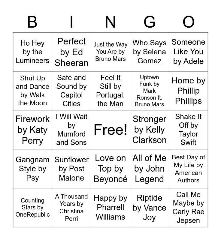 This bingo card has a free space and 24 words: Sunflower by Post Malone, A Thousand Years by Christina Perri, Feel It Still by Portugal. the Man, Counting Stars by OneRepublic, Someone Like You by Adele, Ho Hey by the Lumineers, Shut Up and Dance by Walk the Moon, Perfect by Ed Sheeran, Stronger by Kelly Clarkson, Love on Top by Beyoncé, Uptown Funk by Mark Ronson ft. Bruno Mars, Firework by Katy Perry, All of Me by John Legend, Best Day of My Life by American Authors, Safe and Sound by Capitol Cities, Riptide by Vance Joy, Shake It Off by Taylor Swift, Just the Way You Are by Bruno Mars, Home by Phillip Phillips, I Will Wait by Mumford and Sons, Call Me Maybe by Carly Rae Jepsen, Gangnam Style by Psy, Who Says by Selena Gomez and Happy by Pharrell Williams.