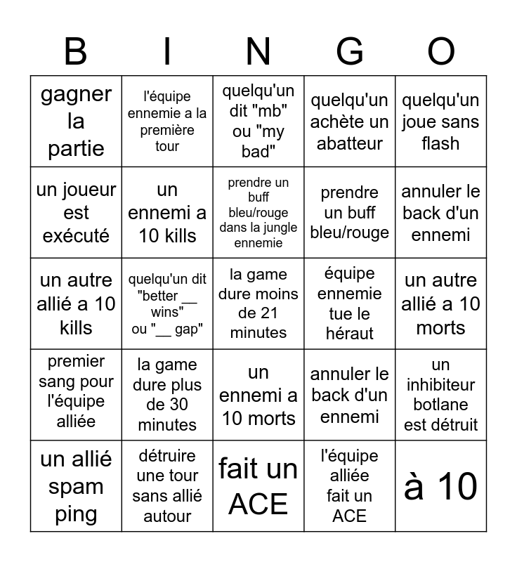 This bingo card has 113 words: équipe alliée tue le héraut, équipe ennemie tue le héraut, quelqu'un prend un triplé, prendre un doublé, avoir 1 mort ou moins à 10 minutes, un allié a 30 ou plus en score de vision, quelqu'un achète un abatteur, un inhibiteur botlane est détruit, un inhibiteur toplane est détruit, quelqu'un vole le Nashor, un allié vole un Drake, un ennemi vole un Drake, un ennemi demande un report, un joueur se plaint d'un champion, un ennemi a 10 kills, un autre allié a 10 kills, un ennemi a 10 morts, un autre allié a 10 morts, avoir +85CS à 10 minutes (si support, prendre score ADC), un allié parle mal à un autre, un allié spam ping, quelqu'un dit "mb" ou "my bad", la game dure moins de 21 minutes, la game dure plus de 30 minutes, gagner la partie, premier sang pour l'équipe alliée, détruire une tour sans allié autour, l'équipe alliée a la première tour, l'équipe ennemie a la première tour, un allié veut FF15, annuler le back d'un ennemi, prendre un buff bleu/rouge dans la jungle ennemie, quelqu'un dit "better __ wins" ou "__ gap", quelqu'un fait des bottes de mobilité, un allié a 0 kills et assists à 10 minutes, quelqu'un joue sans flash, un joueur ne parle pas anglais, une équipe a l'âme d'un dragon, aucun kill avant 3 minutes, deux joueurs ont le même item mythique, un allié demande un report, avoir une note A ou mieux, un allié montre sa maîtrise 7, quelqu'un a 5 morts ou plus à 10 minutes, un joueur est légendaire, l'équipe ennemie fait un ACE, l'équipe alliée fait un ACE, un joueur est exécuté, mourir d'un embrasement, Yasuo/ Lee Sin/ Ezreal est dans la game, équipe alliée tue le héraut, équipe ennemie tue le héraut, quelqu'un prend un triplé, prendre un doublé, avoir 1 mort, ou moins, à 10, minutes, un allié a 30 ou plus en score de vision, quelqu'un achète un abatteur, un inhibiteur botlane est détruit, un inhibiteur toplane est détruit, quelqu'un vole le Nashor, un allié vole un Drake, un ennemi vole un Drake, un ennemi demande un report, un joueur se plaint d'un champion, un ennemi a 10 kills, un autre allié a 10 kills, un ennemi a 10 morts, un autre allié a 10 morts, avoir +85CS à 10 minutes (si support, prendre score ADC), un allié parle mal à un autre, un allié spam ping, quelqu'un dit "mb" ou "my bad", la game dure moins de 21 minutes, la game dure plus de 30 minutes, gagner la partie, premier sang pour l'équipe alliée, détruire une tour sans allié autour, l'équipe alliée a la première tour, l'équipe ennemie a la première tour, un allié veut FF15, annuler le back d'un ennemi, prendre un buff bleu/rouge, dans la jungle ennemie, quelqu'un dit "better __ wins", ou "__ gap", quelqu'un fait des bottes de mobilité, un allié a, 0 kills et, assists à 10 minutes, quelqu'un joue sans flash, un joueur ne parle pas anglais, une équipe, a l'âme, d'un dragon, aucun kill avant 3 minutes, deux joueurs ont le même item mythique, un allié demande un report, avoir une note A ou mieux, un allié montre sa maîtrise 7, quelqu'un a 5 morts ou plus à 10 minutes, un joueur est légendaire, l'équipe ennemie fait un ACE, l'équipe alliée, fait un ACE, un joueur est exécuté, mourir d'un embrasement, Yasuo/, Lee Sin/, Ezreal est and dans la game.
