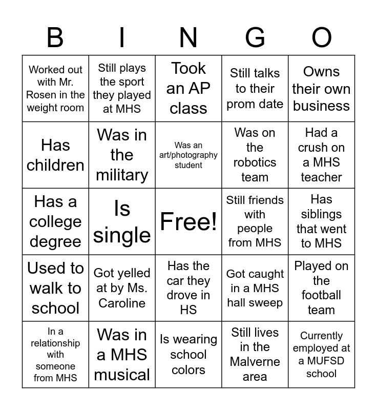 This bingo card has a free space and 29 words: In a relationship with someone from MHS, Played in the band, Is wearing school colors, Still lives in the Malverne area, Owns their own business, Has children, Still plays the sport they played at MHS, Is in the Healthcare field, Still friends with people from MHS, Currently employed at a MUFSD school, Has a college degree, Was in the military, Got suspended from school, Got caught in a MHS hall sweep, Has siblings that went to MHS, Moved out of state, Is single, Has the car they drove in HS, Still talks to their prom date, Played on the football team, Used to walk to school, Was in a MHS musical, Was an art/photography student, Was on the robotics team, Had a crush on a MHS teacher, Worked out with Mr. Rosen in the weight room, Got yelled at by Ms. Caroline, Took an AP class and Ranked top 10 in the graduating class.