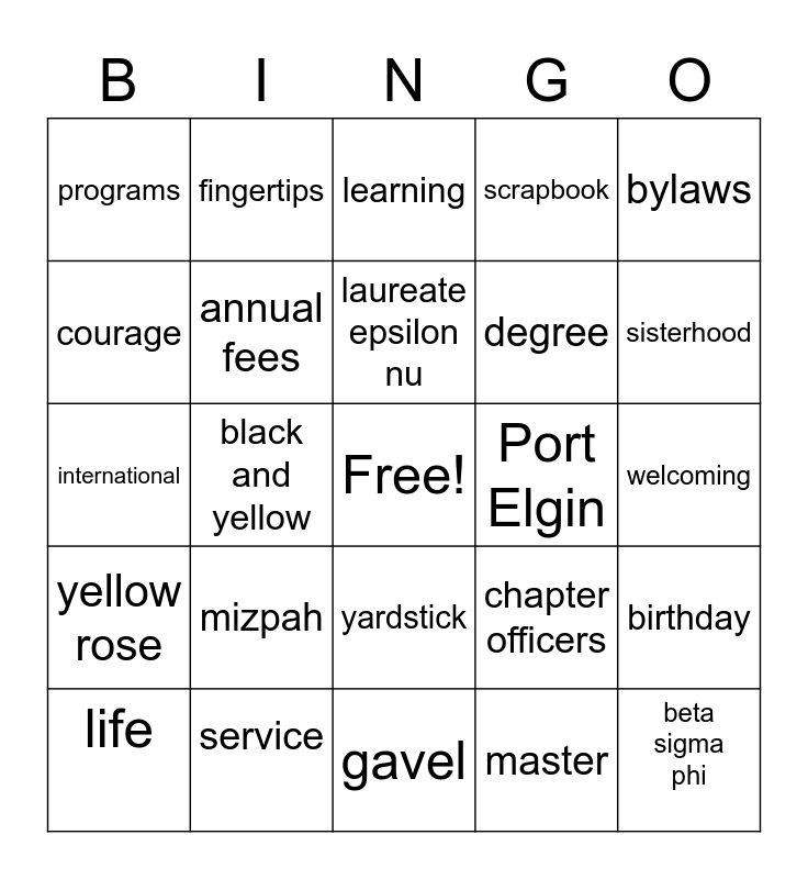 This bingo card has a free space and 29 words: life, torch, black and yellow, chapter, programs, learning, annual fees, mizpah, Port Elgin, service, welcoming, beta sigma phi, gavel, master, sisterhood, election of officers, yardstick, yellow rose, bylaws, international, chapter officers, closing ritual, degree, courage, scrapbook, fingertips, birthday, laureate epsilon nu and food.