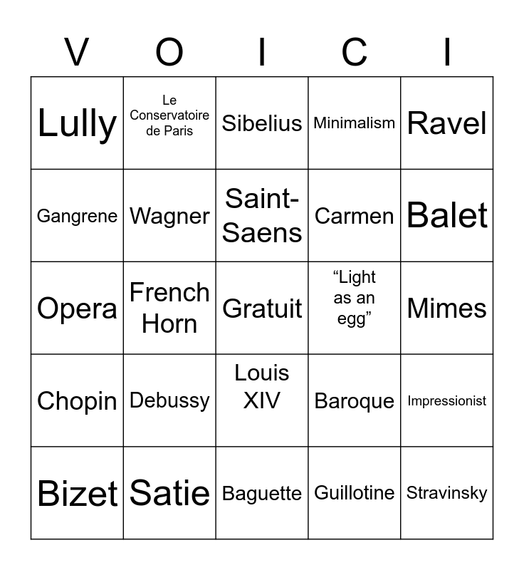 This bingo card has a free space and 24 words: Debussy, Satie, Saint-Saens, Bizet, Ravel, Lully, Gangrene, Le Conservatoire de Paris, “Light as an egg”, Louis XIV, Carmen, Opera, Baroque, Impressionist, Wagner, Guillotine, Mimes, Sibelius, Balet, French Horn, Stravinsky, Chopin, Minimalism and Baguette.