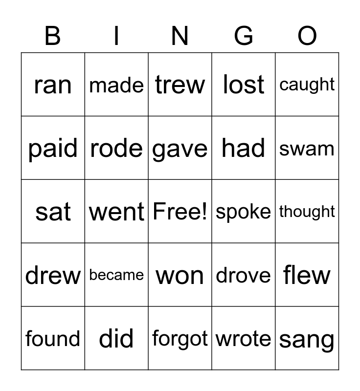 This bingo card has a free space and 24 words: became, did, gave, found, caught, ran, paid, made, spoke, won, had, sat, drove, flew, rode, wrote, thought, trew, swam, went, sang, drew, lost and forgot.