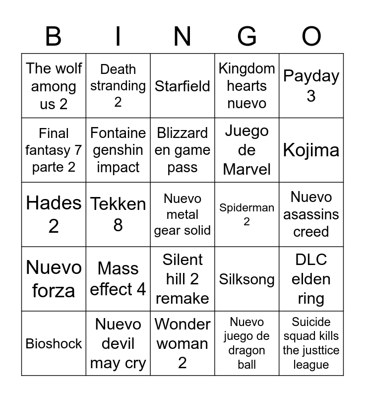 This bingo card has 25 words: Mass effect 4, Wonder woman 2, Blizzard en game pass, Bioshock, Payday 3, The wolf among us 2, Final fantasy 7 parte 2, Death stranding 2, Spiderman 2, Silent hill 2 remake, Juego de Marvel, Hades 2, Silksong, DLC elden ring, Fontaine genshin impact, Suicide squad kills the justtice league, Nuevo asassins creed, Starfield, Kojima, Tekken 8, Nuevo metal gear solid, Nuevo devil may cry, Nuevo forza, Kingdom hearts nuevo and Nuevo juego de dragon ball.
