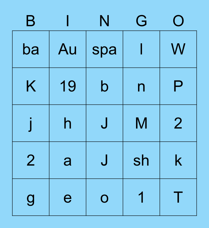 This bingo card has a free space and 24 words: a, e, b, g, W, ba, K, Au, M, J, n, j, sh, k, 19, 1, 2, spa, P, h, T, 2, l and o.