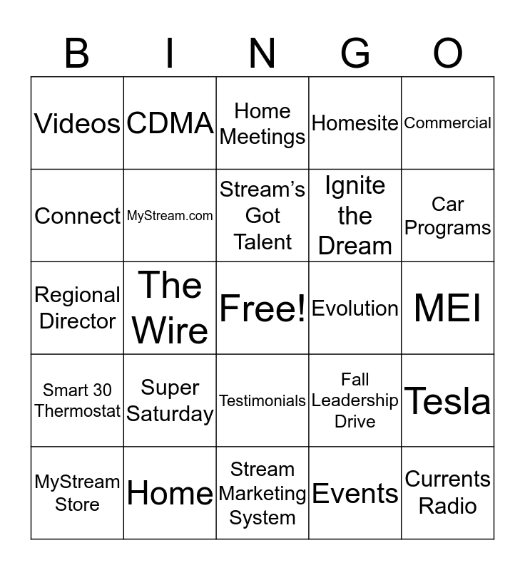 This bingo card has a free space and 70 words: The Stream Way, MEI, Energy, Mobile, Home, Infomart, Homesite, Protective Services, Commercial, 10th Anniversary, Tesla, Leadership, Videos, Home Meetings, Quick Start Kit, The Wire, Testimonials, Ignite the Dream, Tomorrow is Now, Smart 30 Thermostat, Evolution, Fall Leadership Drive, Car Programs, A New Future, Outlet, Newsflash, Training, Get Connected, Events, Mercedes, CDMA, Philanthropy, Promotions, SD Cruise, Top Performers Trip, Tech Support, Power Center, Associate Support, Bouncer, Connect, Ignition, Super Saturday, Currents Radio, Connect Magazine, Currents, MyStream.com, MyStream Store, Network Marketing, Leaderboards, Compensation Plan, Recognition, Pay, Promote, Recognize, Make it easy, Own it & Grow it, Stream Tablet, Stream Marketing System, MLM, Stream’s Got Talent, Business Presentation, Independent Associate, Women of Power, Regional Director, National Director, Managing Director, Executive Director, Presidential Director, Team-Customer Bonus, Free Everything, GSM, Energy 101 and Awards.