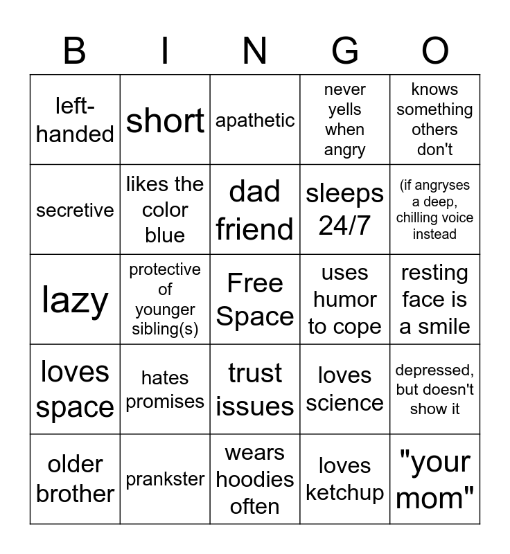 This bingo card has a free space and 24 words: older brother, hates promises, dad friend, loves ketchup, knows something others don't, left-handed, short, apathetic, uses humor to cope, resting face is a smile, lazy, likes the color blue, loves science, depressed, but doesn't show it, secretive, prankster, wears hoodies often, never yells when angry, (if angryses a deep, chilling voice instead, loves space, protective of younger sibling(s), trust issues, sleeps 24/7 and "your mom".