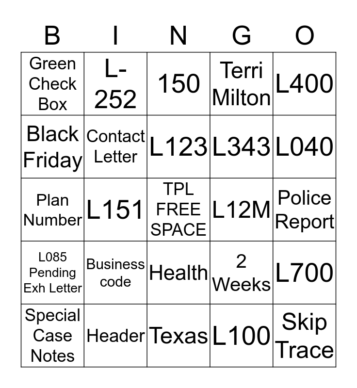 This bingo card has a free space and 24 words: Business code, Header, L123, Special Case Notes, L400, Green Check Box, Black Friday, L-252, L12M, Health, L343, Plan Number, 2 Weeks, L700, Contact Letter, L100, Police Report, 150, L040, L151, Skip Trace, L085 Pending Exh Letter, Terri Milton and Texas.