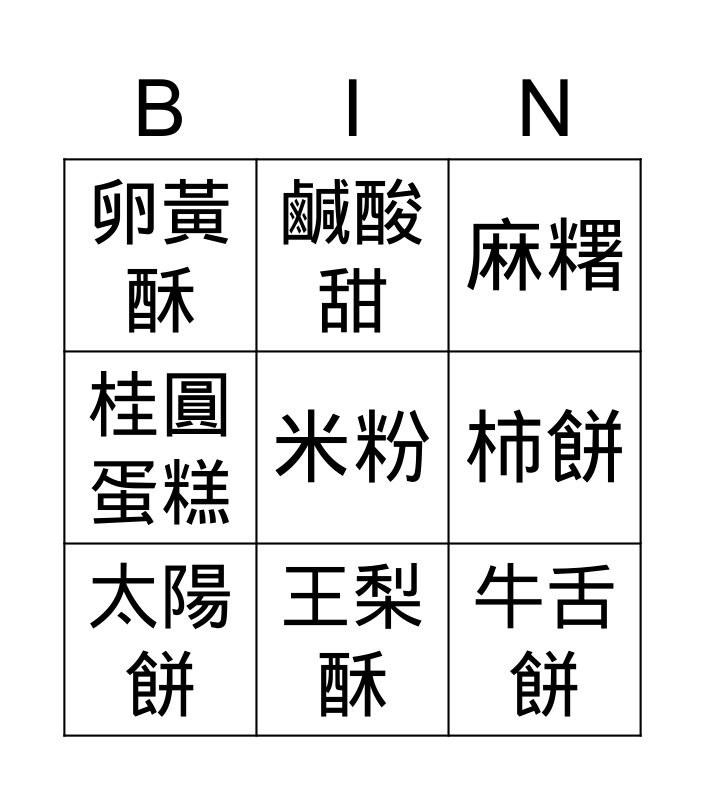This bingo card has a free space and 11 words: 雙糕潤, 王梨酥, 牛舌餅, 太陽餅, 鹹酸甜, 麻糬, 柿餅, 黑糖粿, 桂圓蛋糕, 卵黃酥 and 方塊酥.
