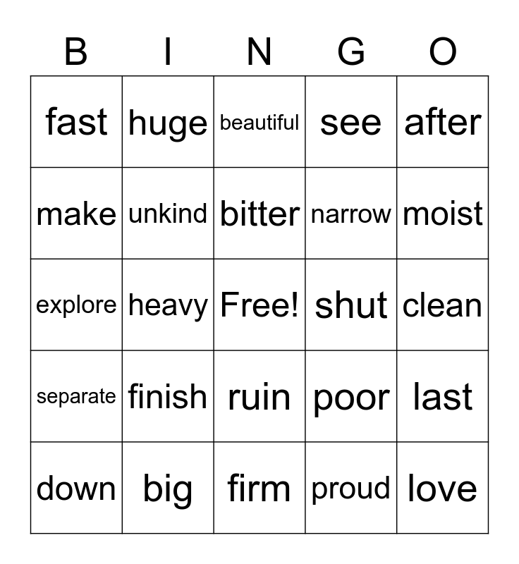 This bingo card has a free space and 24 words: finish, big, bitter, down, after, fast, make, huge, shut, ruin, narrow, explore, poor, last, unkind, proud, clean, beautiful, moist, heavy, love, separate, see and firm.