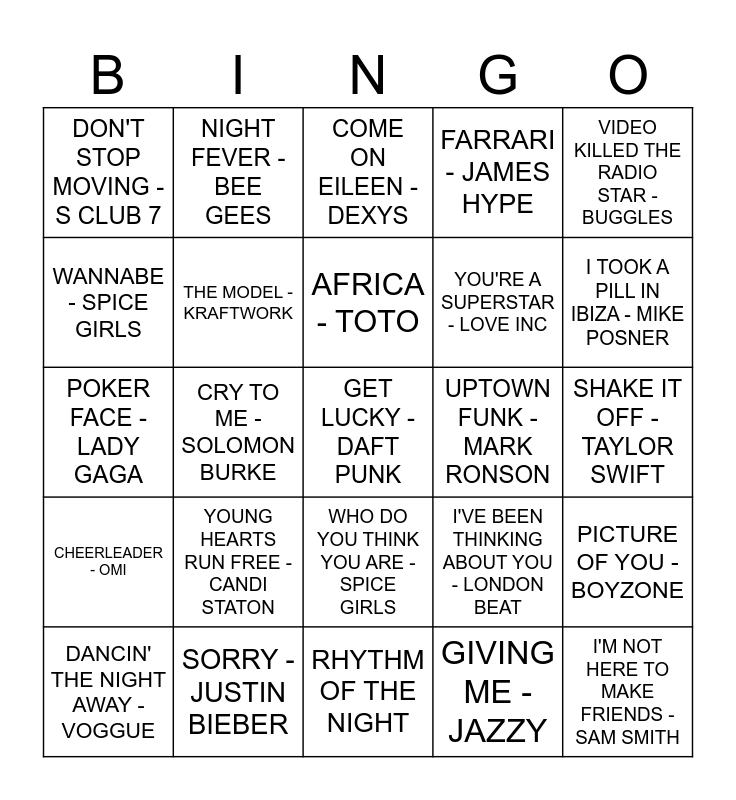 This bingo card has a free space and 48 words: FLOWERS - MILEY CYRUS, I'M NOT HERE TO MAKE FRIENDS - SAM SMITH, REACH - S CLUB 7, RHYTHM OF THE NIGHT, YOUNG HEARTS RUN FREE - CANDI STATON, MOVING ON UP - M PEOPLE, NIGHT FEVER - BEE GEES, FREED FROM DESIRE, WANNABE - SPICE GIRLS, I FEEL IT COMING - THE WEEKEND, THE MODEL - KRAFTWORK, FARRARI - JAMES HYPE, PICTURE OF YOU - BOYZONE, I'VE BEEN THINKING ABOUT YOU - LONDON BEAT, WOMAN - DOJA CAT, NOT FAIR - LILY ALLEN, AFRICA - TOTO, UPTOWN FUNK - MARK RONSON, BILLIE JEAN - MICHAEL JACKSON, VIDEO KILLED THE RADIO STAR - BUGGLES, CRY TO ME - SOLOMON BURKE, GIVING ME - JAZZY, DON'T STOP MOVING - S CLUB 7, YOU'RE A SUPERSTAR - LOVE INC, BARBI GIRL - AQUA, I TOOK A PILL IN IBIZA - MIKE POSNER, DANCIN' THE NIGHT AWAY - VOGGUE, DREAMER - LIVIN' JOY, WHO DO YOU THINK YOU ARE - SPICE GIRLS, CHEERLEADER - OMI, MR VAIN - CULTURE BEAT, FEEL THE NEED - LEIF GARRETH, COUNTRY ROADS - HERMES HOUSE BAND, THINGS CAN ONLY GET BETTER - D-REAM, SORRY - JUSTIN BIEBER, RASPUTIN - BONEY M, WHEN YOUR LOOKIN LIKE THAT - WESTLIFE, SHAKE IT OFF - TAYLOR SWIFT, SHOTGUN - GEORGE EZRA, SUSSUDIO - PHIL COLLINS, DANCING QUEEN - ABBA, BOOM BOOM - VANGABOYS, COME ON EILEEN - DEXYS, FIREWORK - KATY PERRY, POKER FACE - LADY GAGA, WE FOUND LOVE - RIHANNA, HUMAN - KILLERS and BORN SLIPPY - UNDERWORLD.