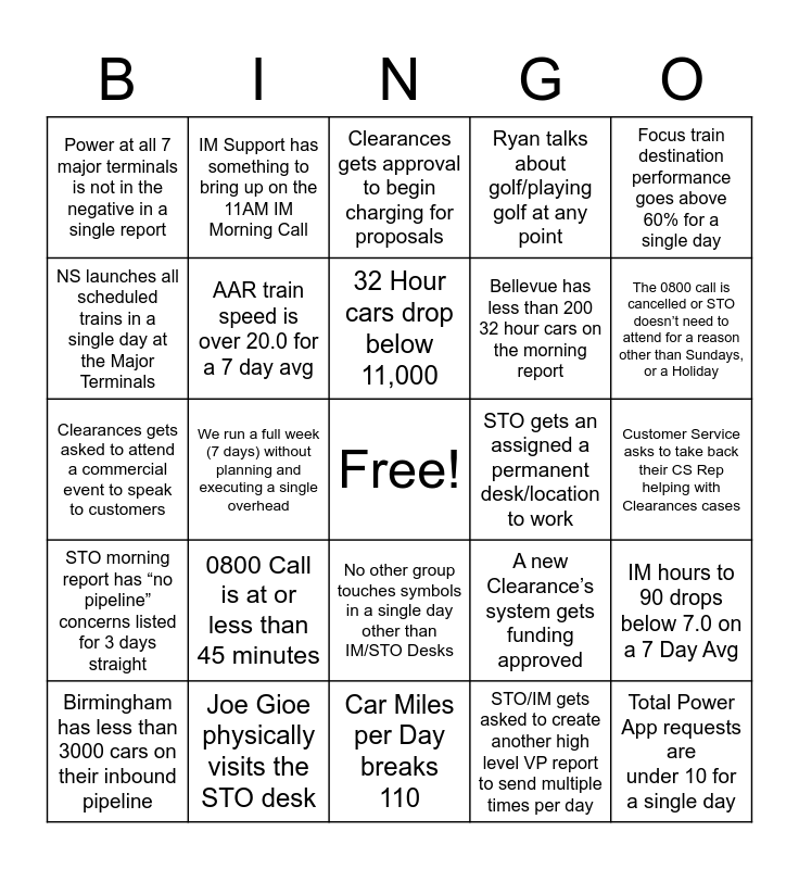 This bingo card has a free space and 24 words: 0800 Call is at or less than 45 minutes, Joe Gioe physically visits the STO desk, 32 Hour cars drop below 11,000, Birmingham has less than 3000 cars on their inbound pipeline, Focus train destination performance goes above 60% for a single day, Power at all 7 major terminals is not in the negative in a single report, NS launches all scheduled trains in a single day at the Major Terminals, IM Support has something to bring up on the 11AM IM Morning Call, STO gets an assigned a permanent desk/location to work, No other group touches symbols in a single day other than IM/STO Desks, Bellevue has less than 200 32 hour cars on the morning report, Clearances gets asked to attend a commercial event to speak to customers, A new Clearance’s system gets funding approved, IM hours to 90 drops below 7.0 on a 7 Day Avg, AAR train speed is over 20.0 for a 7 day avg, STO/IM gets asked to create another high level VP report to send multiple times per day, Customer Service asks to take back their CS Rep helping with Clearances cases, Clearances gets approval to begin charging for proposals, The 0800 call is cancelled or STO doesn’t need to attend for a reason other than Sundays, or a Holiday, We run a full week (7 days) without planning and executing a single overhead, Total Power App requests are under 10 for a single day, STO morning report has “no pipeline” concerns listed for 3 days straight, Ryan talks about golf/playing golf at any point and Car Miles per Day breaks 110.